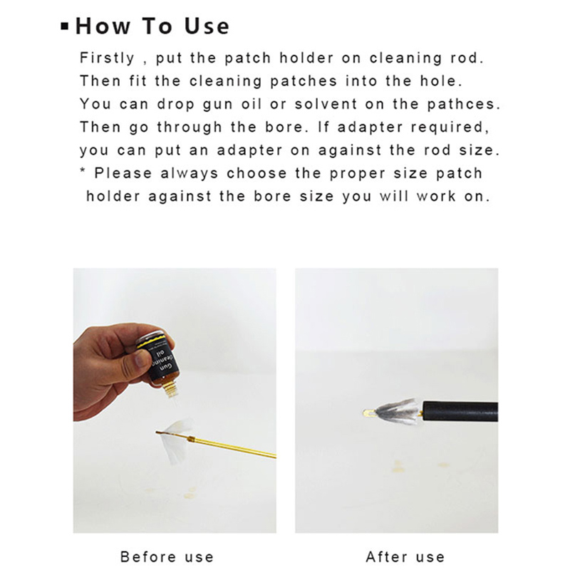 ● Держатели/насадки для чистки оружия с прорезями 4 размеров подходят для калибров от .177cal./4,5 мм до 12 калибра, подходят для винтовок, пистолетов, дробовиков.