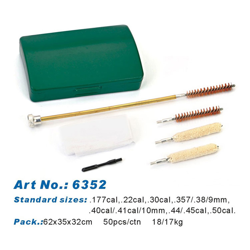 Маленький пластиковый набор для чистки пистолета ● Изогнутый пластиковый корпус не скользит по столу. ● Прочные щетки и держатель накладок с прорезями удобны для очистки канала ствола. ● 2 латунные щетки и 2 хлопковые швабры. Если один из них исчерпан, вы можете использовать следующий. ● Повесить и эффективно ● Легко наклеить наклейку и логотип OEM или клиента.